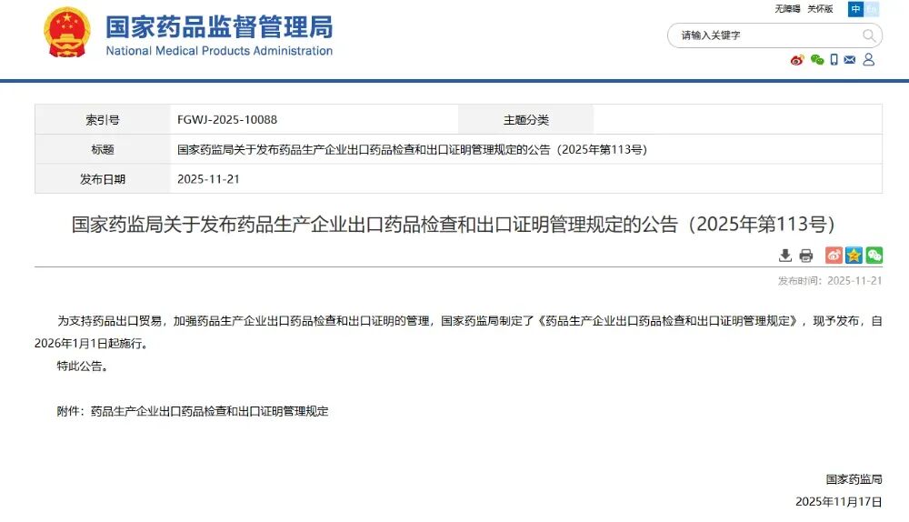 近日,国家药监局发布《药品生产企业出口药品检查和出口证明管理规定》(以下称《规定》),自2026年1月1日起施行。